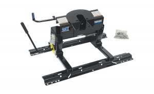 This fifth-wheel trailer hitch hauls trailers up to 20,000 lbs and features a lockable double jaw on a floating head for effortless hookup. Hitch height adjusts from 13″ to 17″. Rails and universal 10-bolt installation kit included. Available in fixed or slider system.